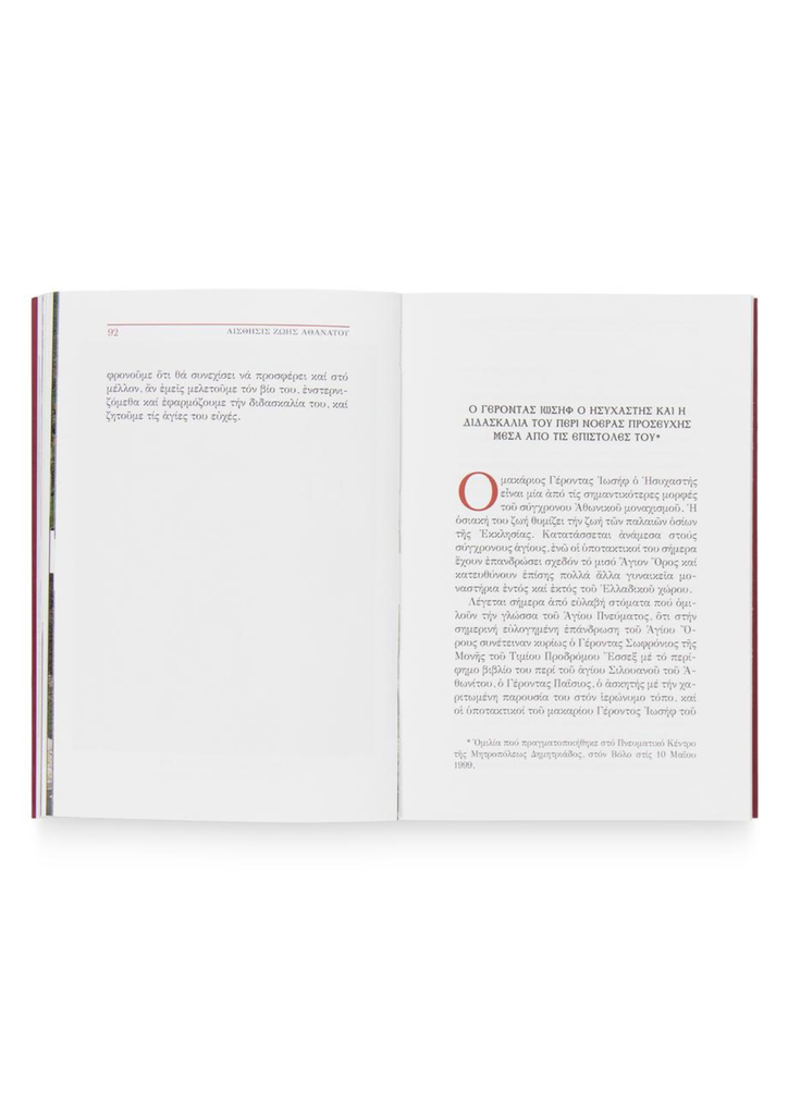 Η έκδοση αυτή αποτελεί μία συλλογή ομιλιών και άρθρων του Καθηγουμένου της Ι.Μ. Μονής Βατοπαιδίου, αρχιμανδρίτου Εφραίμ, που είχαν γίνει για τον Άγιο Ιωσήφ τον Ησυχαστή (1897-1959) πριν την αγιοκατάταξή του και δημοσιεύτηκαν κατά καιρούς σε συλλογικούς τόμους και περιοδικά. Ο Άγιος Ιωσήφ έχοντας αποκτήσει βαθιά συνείδηση ότι ο άνθρωπος δεν είναι ένα πρόσκαιρο δημιούργημα, είναι προσκεκλημένος για την αιωνιότητα, πόθησε και κοπίασε σκληρά για την απόκτησή της. Ο άνθρωπος, που περικλείει ένα ανεξάντλητο μυστήριο με αιώνιες διαστάσεις, καταξιώνεται στην ένωσή του με τον Θεό, στην εμπειρική γνώση του Θεού. Αυτήν την γνώση ο μεγάλος ησυχαστής Αββάς Ισαάκ ο Σύρος, του οποίου τα έργα ο μακάριος Γέροντας Ιωσήφ είχε ως το προσφιλέστατό του εγκόλπιο, ονομάζει ως «αίσθησιν ζωής αθανάτου». Η γνώση του Θεού δεν είναι διανοητική, αλλά η εν αισθήσει κοινωνία με τον Θεό διά της Χάριτός Του.